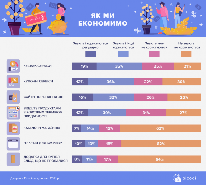 Меньшей популярностью среди украинских потребителей пользуются приложения для покупки нераспроданных блюд (64% опрошенных не знают, что это), каталоги магазинов (63%), плагины для браузера (62%) и отделы с продуктами с коротким сроком годности (27% не знают про такие отделы, а 31% слышали, но не покупают там).