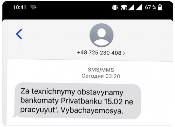 Пользователи получают SMS-рассылку с текстом о том, что банкоматы «Приватбанка» якобы не будут работать 15 февраля 2022 года из-за технических обстоятельств.
