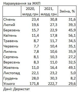 Начисления за жилищно-коммунальные услуги с учетом электроэнергии за 2021 год составили 222,7 млрд гривен. Это на 29,6% (на 50,9 млрд гривен) больше, чем в 2020 году (171,8 млрд гривен).