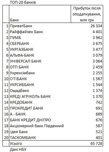 По данным НБУ, 65 банков из 71 получили прибыль на сумму 65,976 млрд гривен, а 6 банков показали убытки на 248 млн гривен.