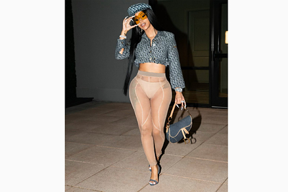 На размещенном в сети фото 28-летняя знаменитость запечатлена в полный рост в вещах модного дома Dior. На ней — укороченная серая рубашка и кепи такого же цвета с монограммой бренда, а также полупрозрачные лосины, через ткань которых были видны трусы. Свой образ исполнительница дополнила серо-бежевой сумкой, босоножками на каблуках и широким очками.