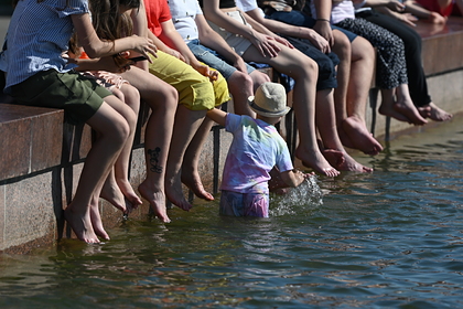 Отдыхающие в жаркую погоду сидят у фонтана на ВДНХ в МосквеОтдыхающие в жаркую погоду сидят у фонтана на ВДНХ в Москве
