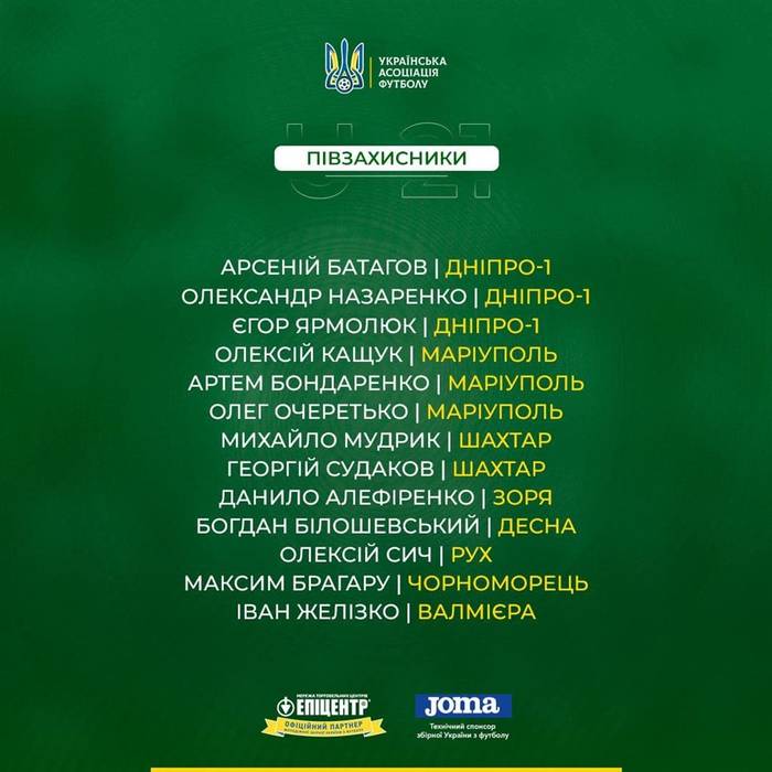 Полузащитники: Арсений Батагов, Александр Назаренко, Егор Ярмолюк (Днепр-1), Алексей Кащук, Артем Бондаренко, Олег Очеретько (все — Мариуполь), Михаил Мудрик, Георгий Судаков (оба — Шахтер), Даниил Алефиренко (Заря), Богдан Билошевский (Десна), Алексей Сыч (Рух), Максим Брагару (Черноморец), Иван Желизко (Валмиера, Латвия).