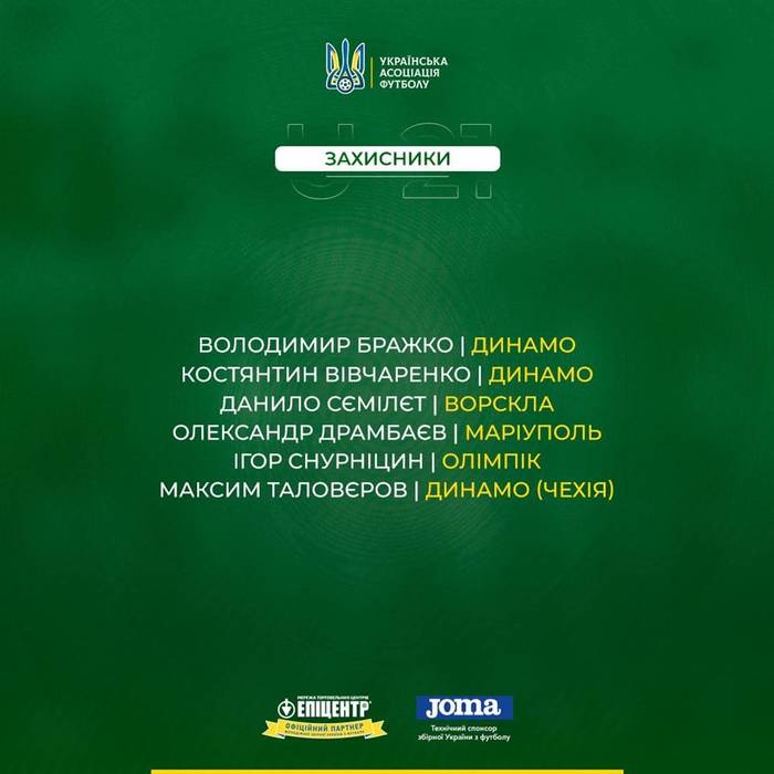 Защитники: Владимир Бражко, Константин Вивчаренко (оба — Динамо Киев), Даниил Семилет (Ворскла), Александр Драмбаев (Мариуполь), Игорь Снурницын (Олимпик), Максим Таловеров (Динамо Ческе Будеевице, Чехия).
