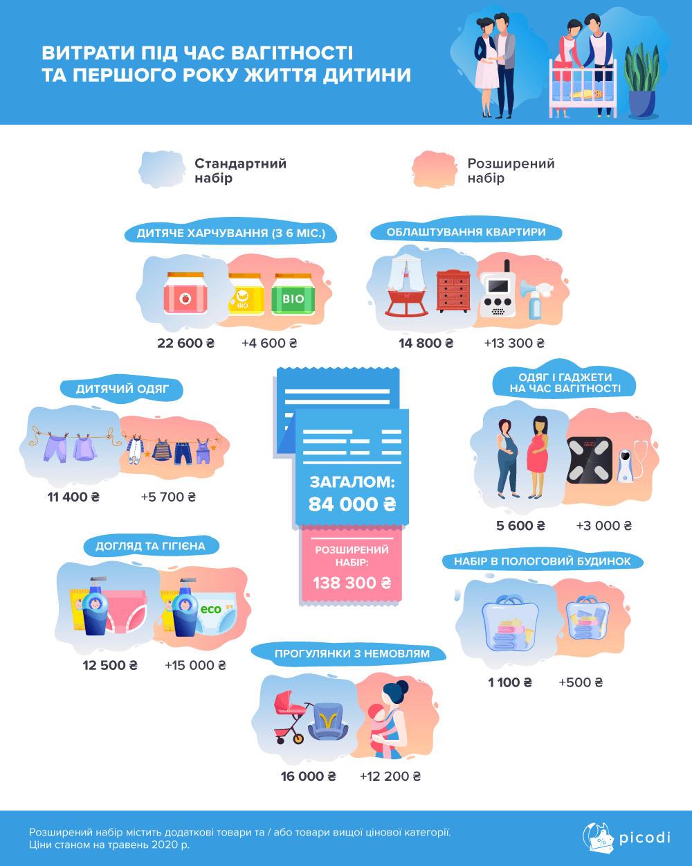 Суммируя все покупки, связанные с беременностью и первым годом жизни ребёнка, можно сказать, что траты на базовый набор составляют 84 000 гривен, а на расширенный — 138 300 гривен.
