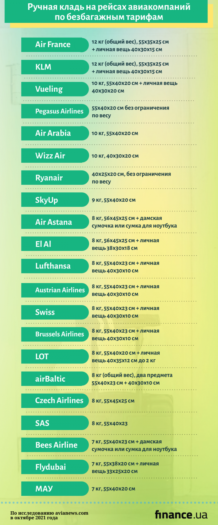 В 2021 году более двадцати авиакомпаний продают билеты без багажа на рейсах из Украины, показало исследование avianews.com. Это делают как лоукостеры, так и много классических авиаперевозчиков.