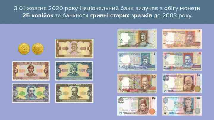 С 1 октября 2020 года украинцы не смогут использовать при расчетах наличными монеты номиналом 25 копеек и банкноты старых образцов до 2003 года.