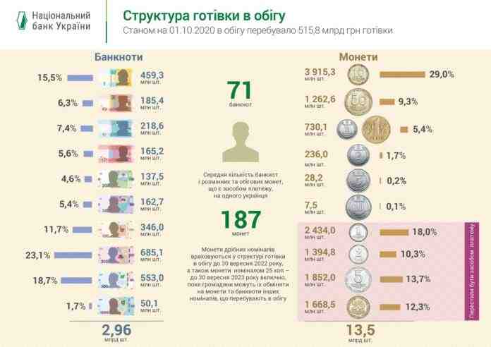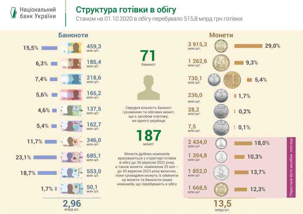 “На 1 октября 2020 года в наличном обращении Украины находилось наличности на сумму 515,8 млрд грн, в том числе банкнот – на 512,7 млрд грн (2,96 млрд штук) и монет – на 3 млрд грн (13,5 млрд штук). С начала этого года наличность в обращении выросла на 90,8 млрд грн, или на 21,4%. Однако, несмотря на рост наличных денег в обращении, их удельный вес в денежной массе остается практически на уровне прошлых лет”,- говорится в сообщении.