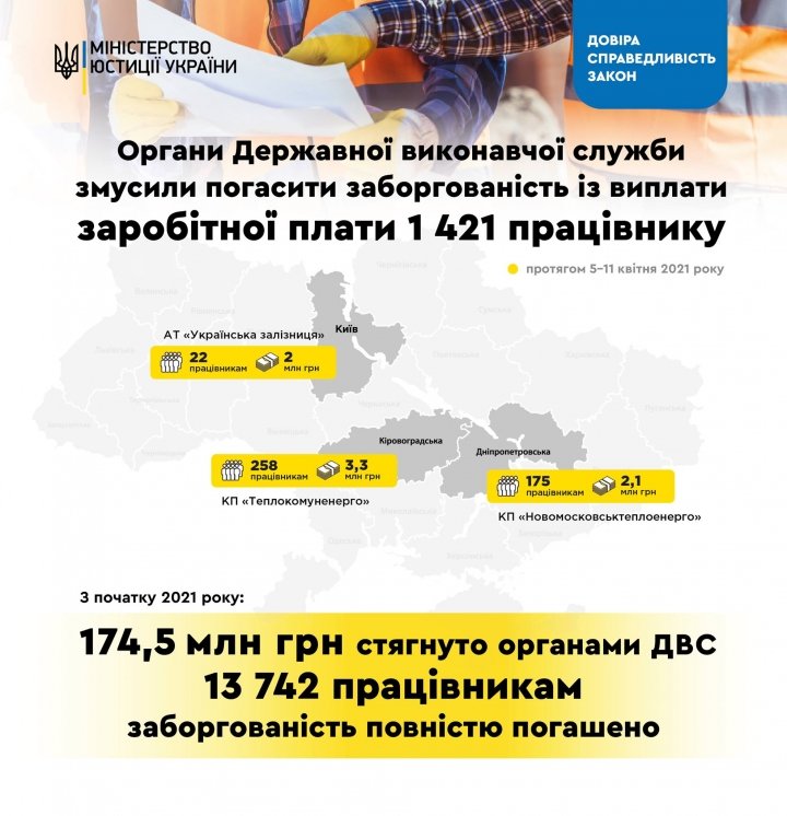Всего с начала 2021 года органы Государственной исполнительной службы Министерства юстиции взыскали 174,5 млн грн. Задолженность по зарплате полностью погашена 13 742 работникам.