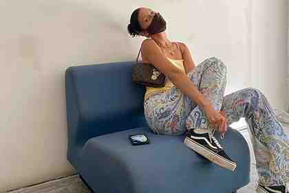 На снимке 23-летняя модель фотографирует себя в зеркало. Она одета в облегающий топ на бретельках, под которым нет нижнего белья, голубые расклешенные брюки с орнаментом и черные кеды марки Vans. Из аксессуаров на ней — маленькая наплечная сумках модного дома Louis Vuitton, дизайн которой также был популярен в конце прошлого века, массивные золотистые украшения и защитная маска.