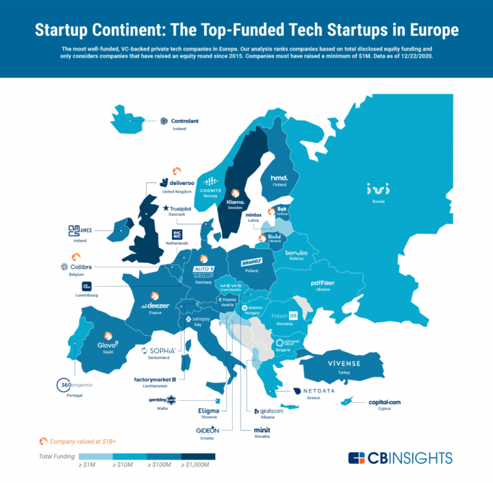 Во время составления карты в CB Insights учитываются только независимые от больших игроков стартапы, которые открыто привлекали деньги с 2015 года и не находятся в полной собственности одного из акционеров. За это время стартапам из Европе удалось привлечь почти $117 млрд инвестиций.