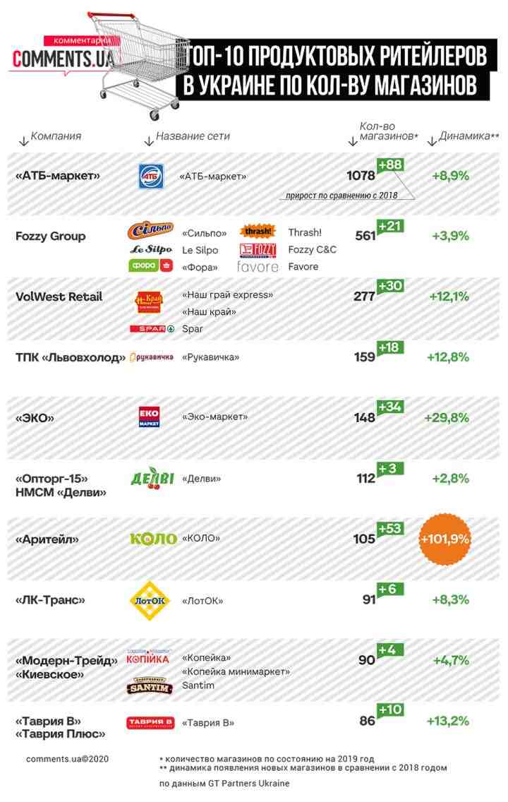 Самой крупной в Украине сегодня является сеть продуктовых супермаркетов “АТБ-маркет”. В нашей стране их насчитывается 1078, при этом в течение года, с 2018 по 2019 год, сеть открыла 88 магазинов.