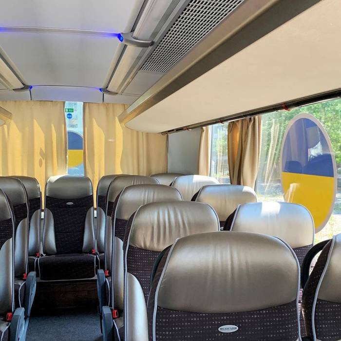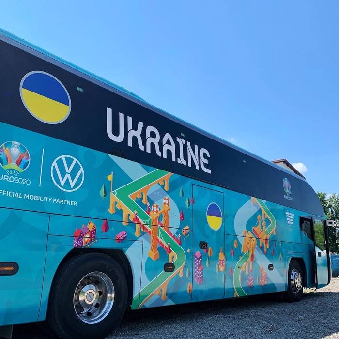 Транспортное средство выполнено в традиционных цветах Евро, а на окнах красуется надпись — Ukraine, вместе с флагом страны.