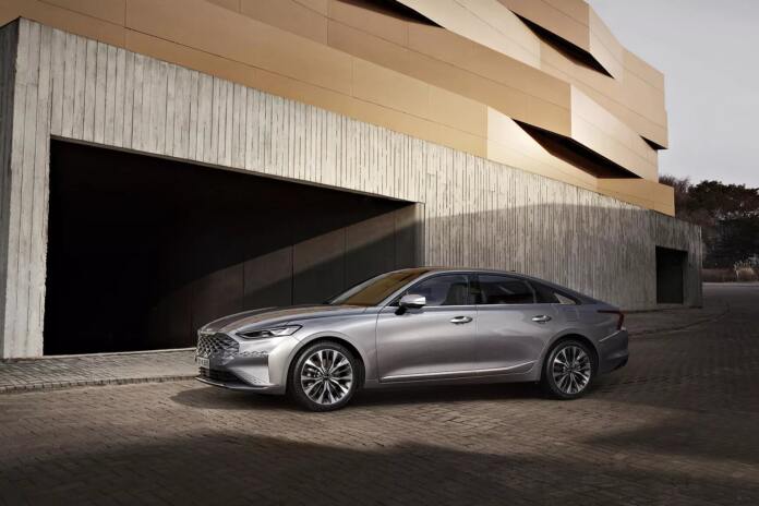 Переднюю часть кузова Kia K8 украшает фирменная радиаторная решетка, которая из-за отсутствия рамки кажется единым целым с бампером. Кроме того, она выглядит так, как будто ее можно просто снять и переместить на электромобиль, закрыв ромбовидные элементы. Некоторые считают такое решение неслучайным.