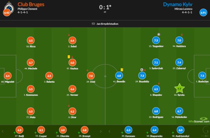 Лучшим игроком Брюгге стал нападающий Бас Дост — 7.0. А вот украинский игрок бельгийского клуба Эдуард Соболь получил оценку 6.4 балла.
