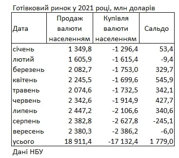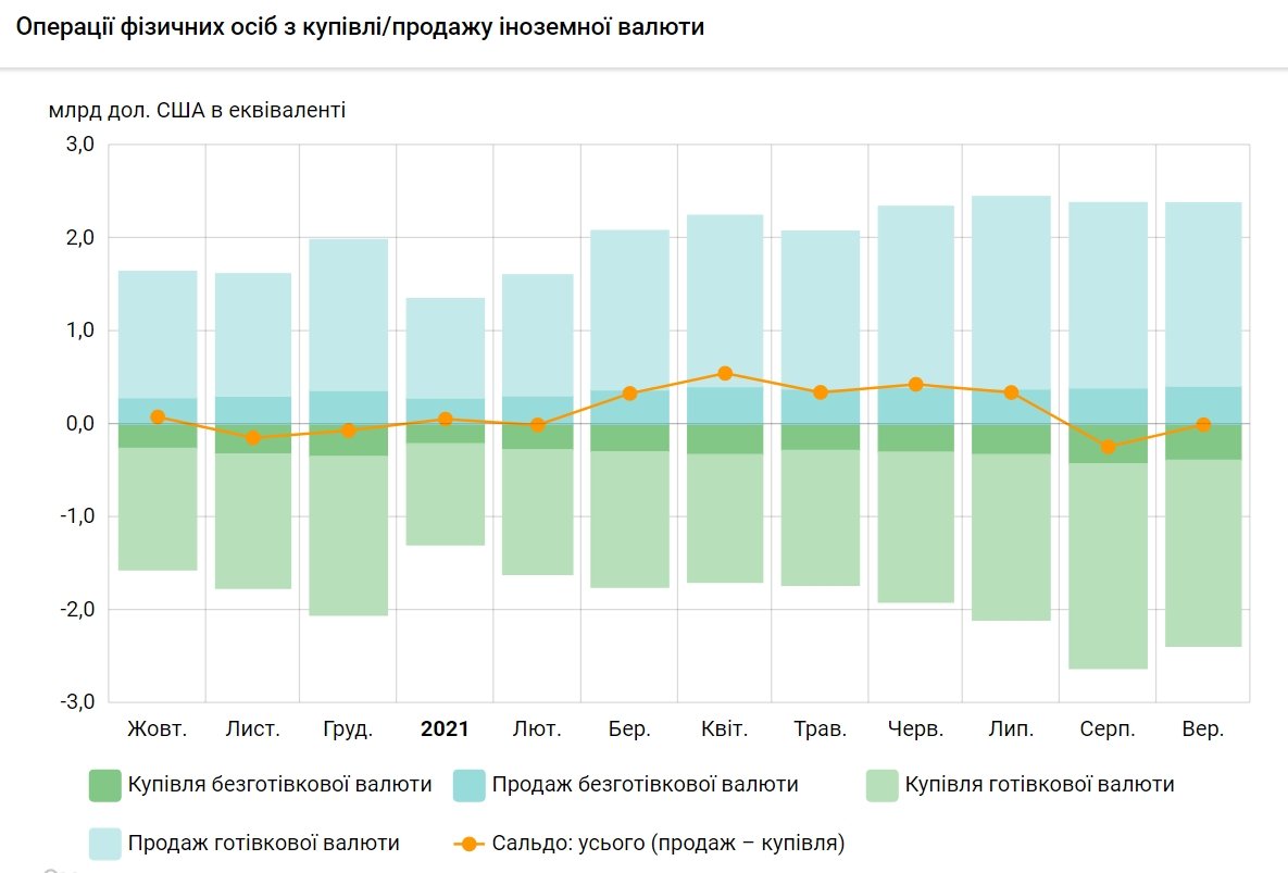 Население Украины в сентябре 2021 года продало коммерческим банкам наличной и безналичной валюты на 2 380,3 млн долларов (в эквиваленте) и купило на 2 386,2 млн долларов.
