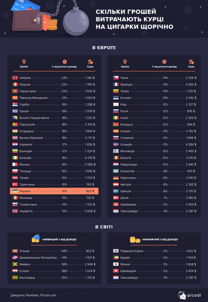 В Украине, выкуривая 1 пачку в день, в течение года можно потратить 823 $. Это равноценно 15% годового среднестатистического дохода после уплаты налогов в нашей стране. Подобные расходы ждут жителей Польши (16%), Молдовы, Турции и Латвии (по 15%).