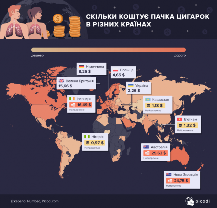 Украина в этом рейтинге занимает 19 позицию со средней стоимостью сигарет 2,26 $ за пачку. В соседней Польше пачка сигарет стоит дороже – 4,65 $ (57 место рейтинга), а в Молдове дешевле — 1,68 $ (11 место).