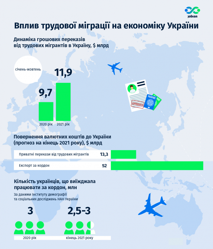 «Трудовая миграция — процесс, который нуждается в поддержке со стороны государства. Украинцы, которые в основном работают в странах ЕС, ежемесячно возвращают в страну более $ 1 млрд, и это является одним из источников стимулирования экономики страны», — комментирует Ольга Чубенко, основательница онлайн-сервиса работы за рубежом Jobian.
