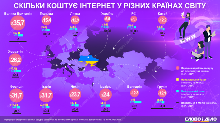 По сравнению с другими странами в Украине достаточно дешевый интернет. Самый дешевый пакет интернета в месяц стоит у нас 3,6 доллара, а самый дорогой – 13,5 доллара. Средняя стоимость доступа к сети составляет 6,5 доллара (около 180 гривен).