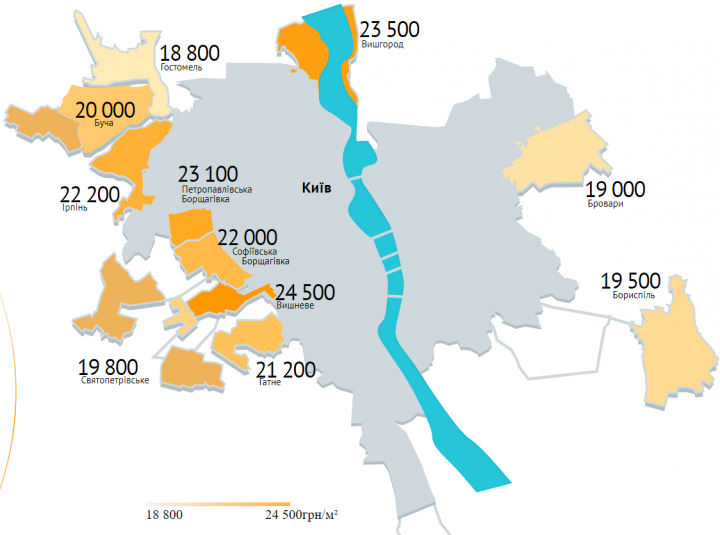 Чуть дороже квадратные метры обойдутся в Броварах (19 000 грн/кв. м), Борисполе (19 500/кв. м) и Святопетровском (19 800/кв. м).