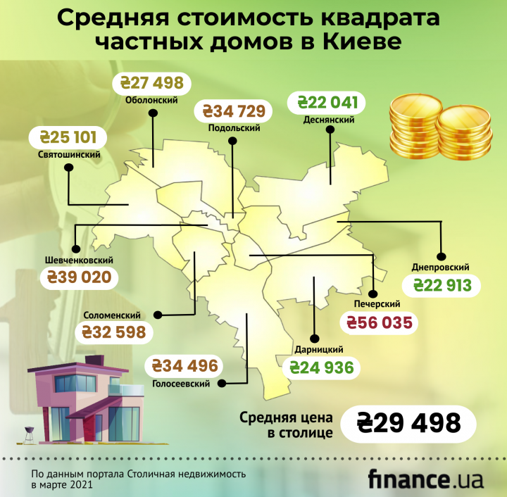 В марте 2021 года средняя цена домов в Киеве составила 29 498 грн. за 1 кв. м, по сравнению с декабрем 2020 года средняя цена домов увеличилась на 3,8%. В долларовом эквиваленте – на 5,7%, до 1 061 долл. США / кв. м (±3,4%).
