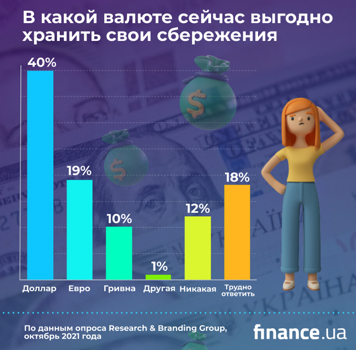 для хранения денежных сбережений наибольшим доверием украинцев пользуется доллар США (40%);