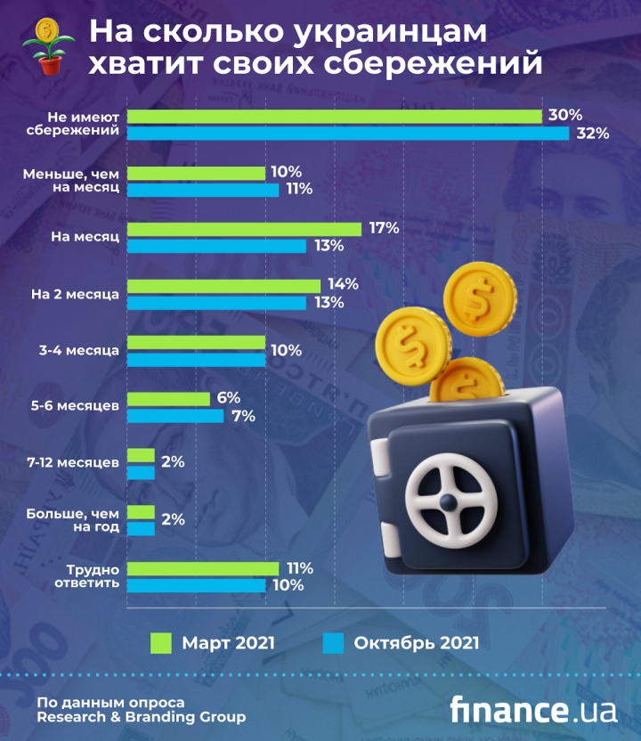 Согласно опросу Research & Branding Group, треть украинцев (32%) не имеют финансовых сбережений, а каждый десятый (10%) не смог определить, на какой срок ему бы их хватило. Среди остальных респондентов ответы распределились следующим образом: