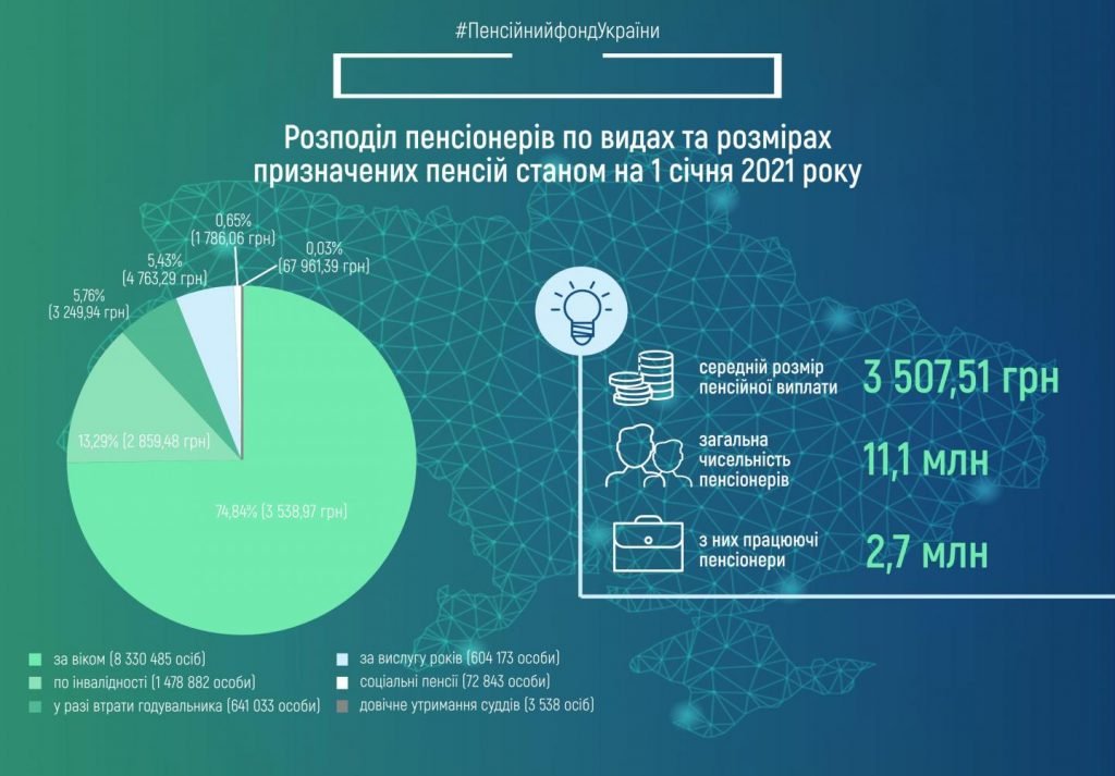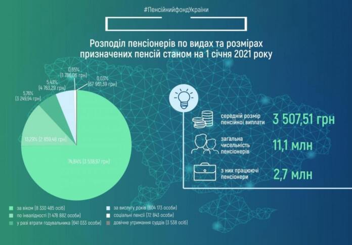 «По состоянию на 1 января 2021 года в Украине насчитывалось 11,1 млн пенсионеров, из них 2,7 млн человек — работающие пенсионеры», — говорится в сообщении.