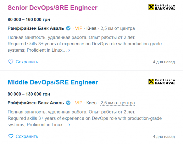 Больше всего в банках получают управляющие, программисты и разработчики приложений. В больших банках таким сотрудникам готовы платить крупные суммы — до 160 тыс. грн. К примеру, подобную вакансию опубликовал Райффайзен Банк Аваль, который находится в поисках Senior DevOps/SRE Engineer.