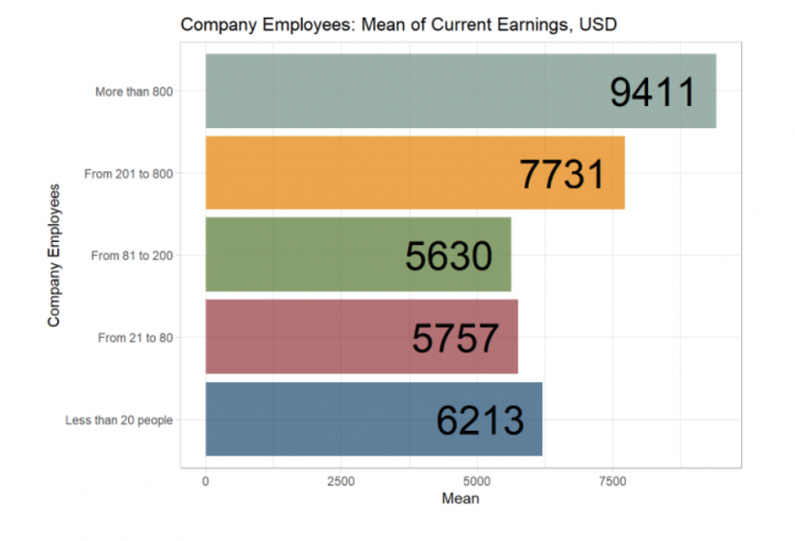 Возраст компании. Соблюдается тенденция: чем старше компания, тем выше зарплата топ-менеджеров. Также из таблицы видно, что в небольших компаниях очень широкая вилка оплаты – от $1460 до $12 000. А вот средний уровень вознаграждения довольно высок.