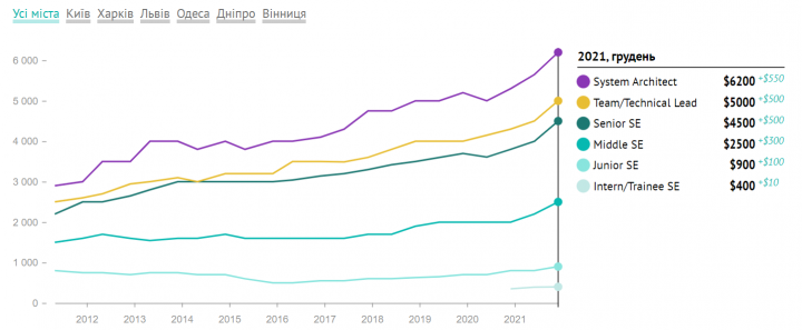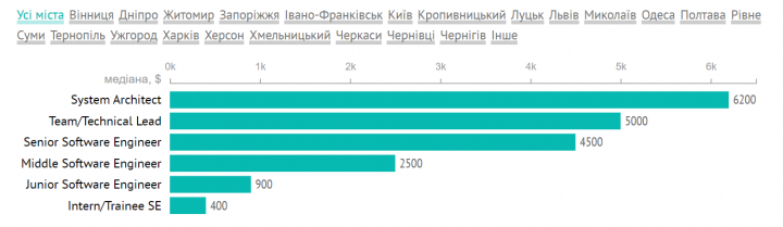 Самая низкая медианная зарплата в Полтаве, Черновцах, Луцке, Житомире — менее $2400. Это может быть связано с низким количеством сеньор-специалистов в этих регионах.