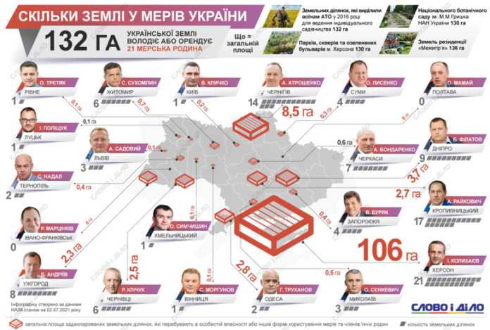 По подсчетам аналитиков, мэры и члены их семей в 2020 году владели (или арендовали) всего 132 гектарами земли. Для сравнения, это почти равно площади Ботанического сада имени Гришко в Киеве или площади парков, скверов и зеленых бульваров в Херсоне. Или же это чуть меньше площади земель «Межигорья».