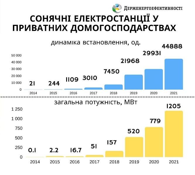 В целом на конец 2021 года в Украине насчитывается около 45 тысяч домохозяйств, которые используют солнечные панели и экономят на счетах за электроэнергию. Общая мощность таких СЭС превысила 1,2 ГВт.