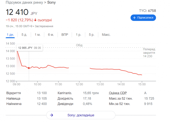 Капитализация Sony по итогам торгов 19 января снизилась на $20 млрд после падения стоимости акций компании на 12,79% после того, как Microsoft объявила о покупке Activision Blizzard. Это крупнейшее однодневное снижение стоимости с марта 2020-го, отмечает Bloomberg.