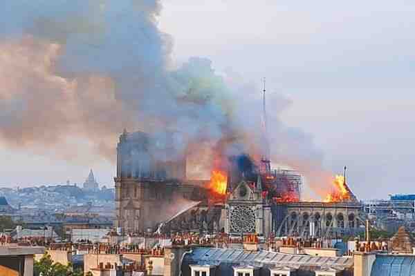 Один из главных символов французской столицы, собор Парижской Богоматери, загорелся вечером 15 апреля. Когда пожарным удалось справиться с огнем, шпиль собора и большая часть его крыши обрушились, серьезно были повреждены стены Нотр-Дама. Хотя многие, хранившиеся в соборе произведения искусства и религиозные реликвии удалось перенести в безопасное место в самом начале чрезвычайной ситуации, другие сильно пострадали, а некоторые предметы искусства были повреждены или вообще уничтожены огненной стихией. Через два месяца после пожара в Нотр-Даме отслужили первую мессу. Ее участникам в целях безопасности пришлось надеть строительные каски.