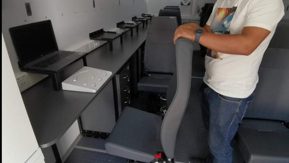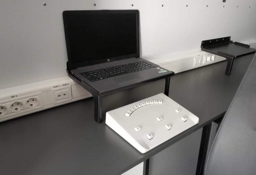 Для проведения тестирования военнослужащих применяются ноутбуки с соответствующей программой. При этом используется специализированная клавиатура с ограниченным количеством кнопок. После тестирования психолог собирает все данные согласно методикам и распечатывает их на принтере. Все 10 кресел в салоне для удобства сделаны поворотными. Сегодня машина как раз проходит определяющие ключевые испытания.