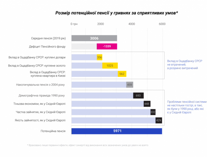 По подсчетам, введение обязательных накопительных пенсий, экономических реформ и сохранении демографии 1990 года позволили бы обеспечить среднюю пенсию на уровне 5971 грн/мес. вместо существующей в 3500 грн/мес.