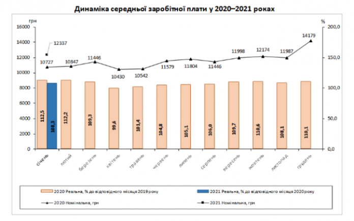 По сравнению с декабрем 2020 года размер средней номинальной заработной платы составил 87,0% (14 179 гривен). Уменьшение начислений в январе к предыдущему месяцу происходит ежегодно и обусловлено тем, что в декабре производятся начисления единовременных выплат: вознаграждений по итогам работы за год, за выслугу лет, компенсационных выплат за неиспользованный отпуск и тому подобное;