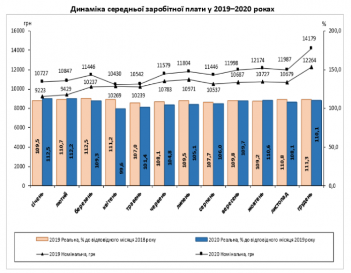 Средняя номинальная заработная плата штатного работника предприятий, учреждений и организаций Украины в декабре 2020 года составила 14 179 гривен. Это на 15,6% (на 1 915 грн) больше по сравнению с декабрем прошлого года (12 264 гривен).