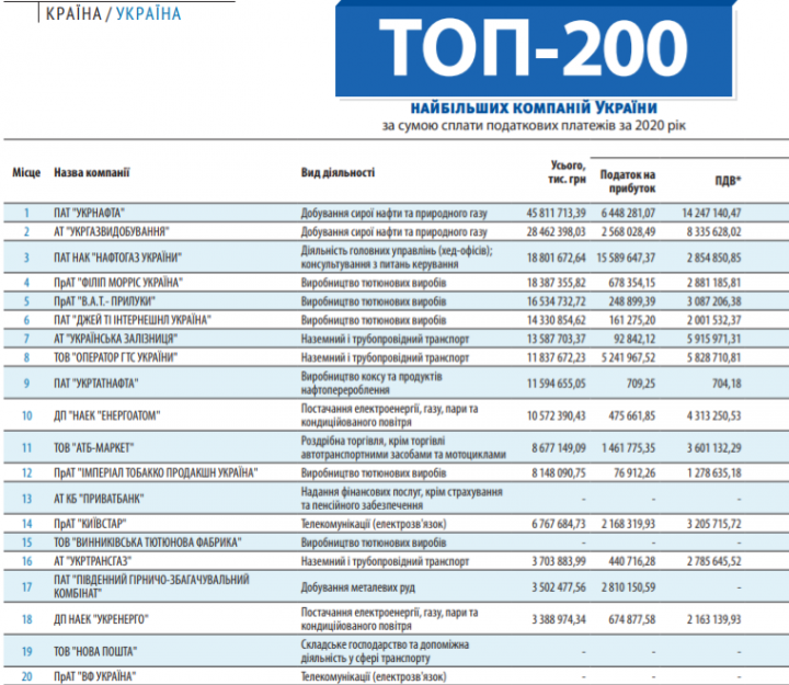 Журнал «Рейтинг» обнародовал ТОП-200 крупнейших налогоплательщиков в Украине в 2020 году.