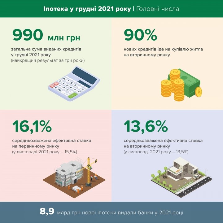 «Банки Украины в декабре 2021 года выдали 1 113 ипотечных кредитов на общую сумму 990 млн грн. Это самый высокий месячный показатель за период опроса банков — с декабря 2018 года. Всего за 2021 год банки выдали 10,8 тысячи ипотечных кредитов на общую сумму 8,9 млрд грн», — сказано в сообщении.