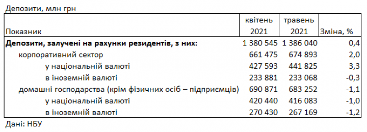 В мае 2021 года ставки по гривневым депозитам для предприятий выросли с 3,9% до 4,0% годовых, по валютным – не изменились – 1,0% годовых.