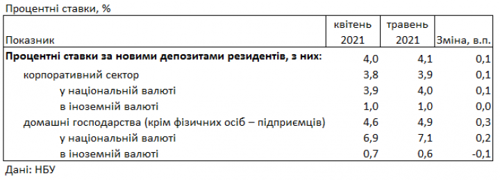 В мае 2021 года средние процентные ставки банков по новым депозитам в гривне для населения составили 7,2% годовых. Это на 0,3 п. п. выше, чем в апреле (6,9%).