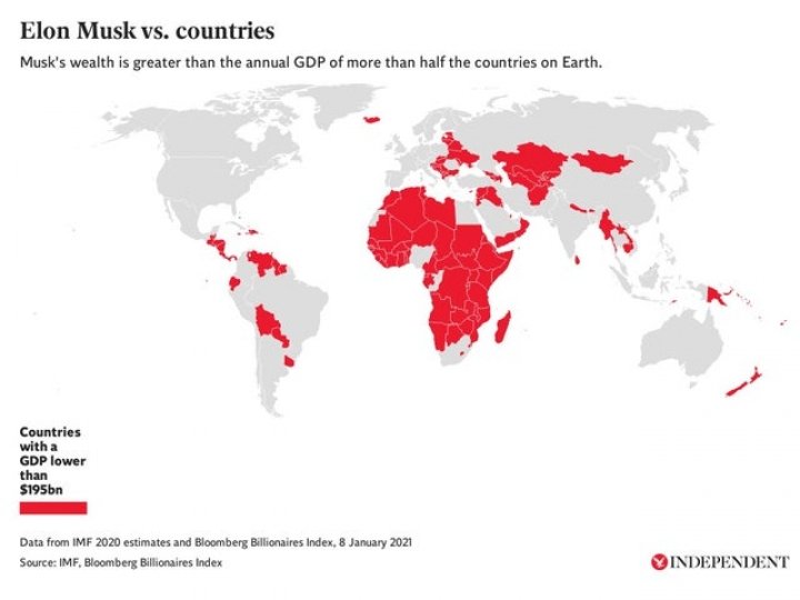 В издании сообщают, что если бы богатство Маска сравнивать с ВВП каждой страны мира, по данным Международного валютного фонда, он был бы на 50-м месте среди самых богатых стран мира. Иными словами, если бы собственный капитал Маска был равномерно распределен между всеми 328 миллионами граждан США, каждый получил бы примерно 600 долларов – ту же сумму, которую правительство США выдало как стимулирующий чек во время пандемии.