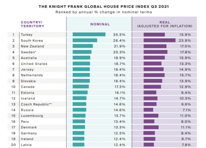 Международная консалтинговая компания Knight Frank составила и опубликовала рейтинг Global House Price Index по итогу третьего квартала 2021 года.