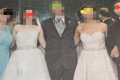 На размещенном в сети снимке невеста одета в белый подвенечный наряд без бретелей и с поясом, украшенным драгоценными камнями. Ее образ дополнила белая фата. Рядом с виновницей торжества запечатлена ее свекровь в точно таком же платье, но без фаты.