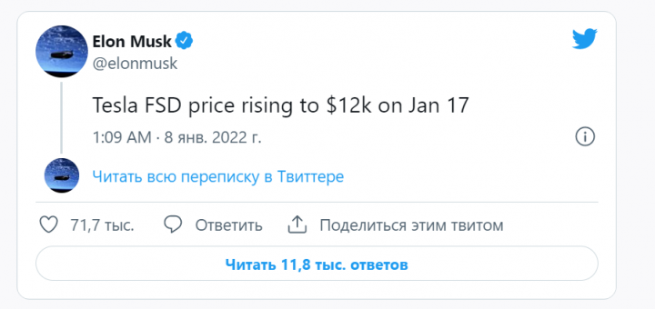 Генеральный директор Tesla Илон Маск сообщил в Twitter, что 17 января компания поднимет цену на свой премиальный пакет помощи водителю Full Self-Driving (FSD). Сейчас его стоимость составляет $10 тыс., а через неделю повысится до $12 тыс.