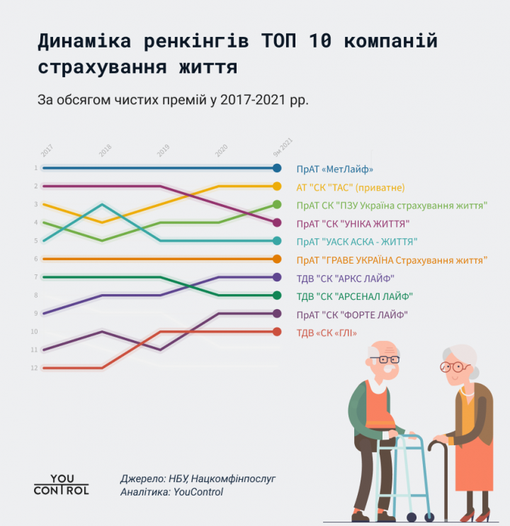 Недавно министр финансов Украины С. Марченко заявил, что «сорокалетним в нынешних условиях не стоит рассчитывать на пенсию». Одной из альтернатив для обеспечения беззаботной старости остаются компании по страхованию жизни. По выводам аналитиков YouControl, объем премий life-страховщиков ежегодно стабильно растет на 17%. Так, за 9 месяцев 2021 года страховые платежи достигли 4,2 млрд грн, а чистая прибыль составила более 280 млн грн.