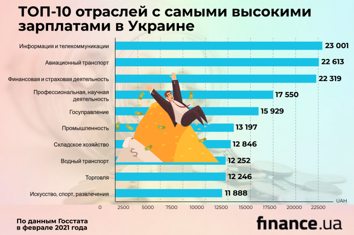также высокие зарплаты в сфере «Финансовая и страховая деятельность» — в феврале 2021 г. они были на уровне 22 319 грн;